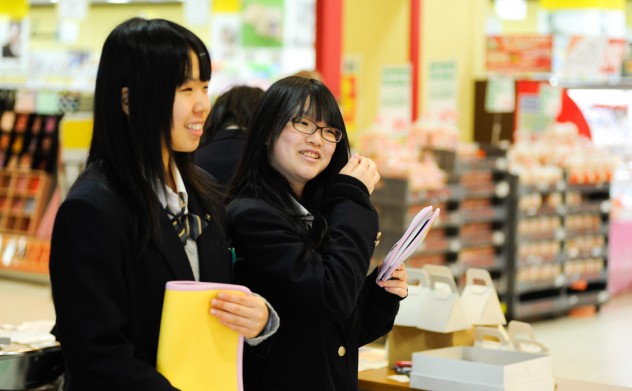 場所は、福島駅北側にある複合型ショッピング施設の一階の特設販売所。学生服姿の高校生たちが、背筋を伸ばして立っている。カラフルな布地の小物を手に持ち、身につけ、声を出し商品をアピールしていた。人の流れが多いその一角に、子ども連れの家族や買い物にきた婦人、夫婦が足を運ぶと商品を指さして高校生たちに質問をしている。
